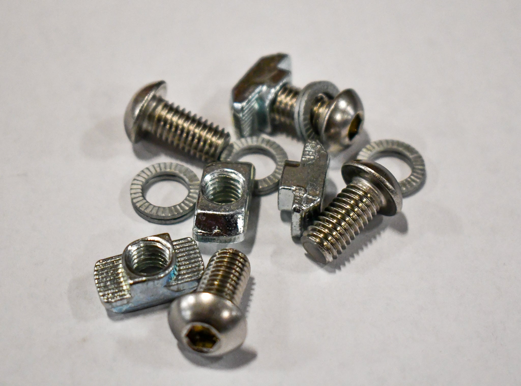 Comes with all needed hardware - M8 T Nuts, M8 button head bolts, and Nordlock washers. Nordlock washers are vibration resistant and take quite a bit of torque to loosen once tightened! These washers will not shake loose on the trail!