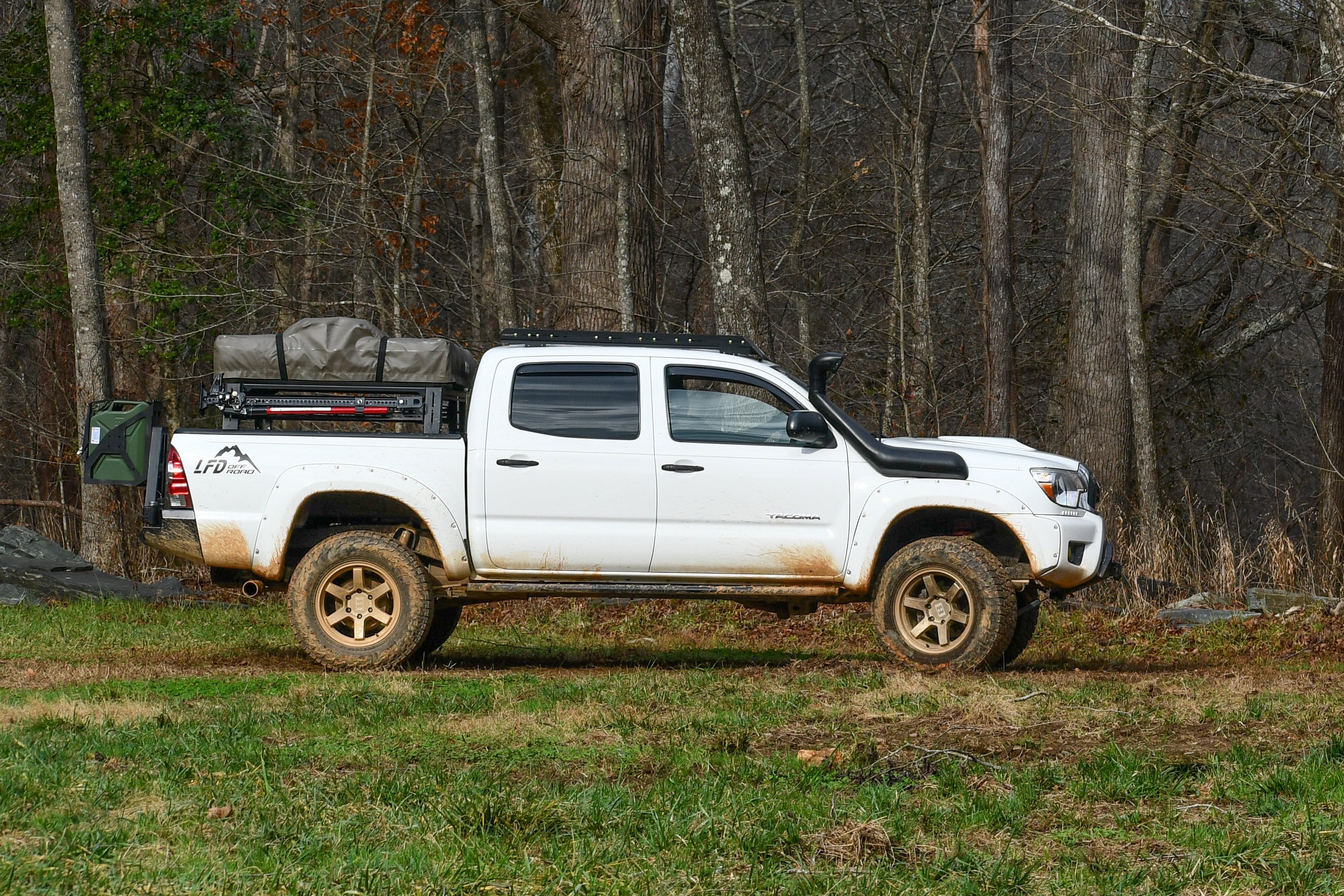 Swing arms can be made with the tire arm on either the driver's side or passenger side. On the accessory arm, options for Rotopax mounts, Jerry Can mounts, Maxtrax and Hi-Lift mounts give you flexibility to arrange your tools how you see fit.