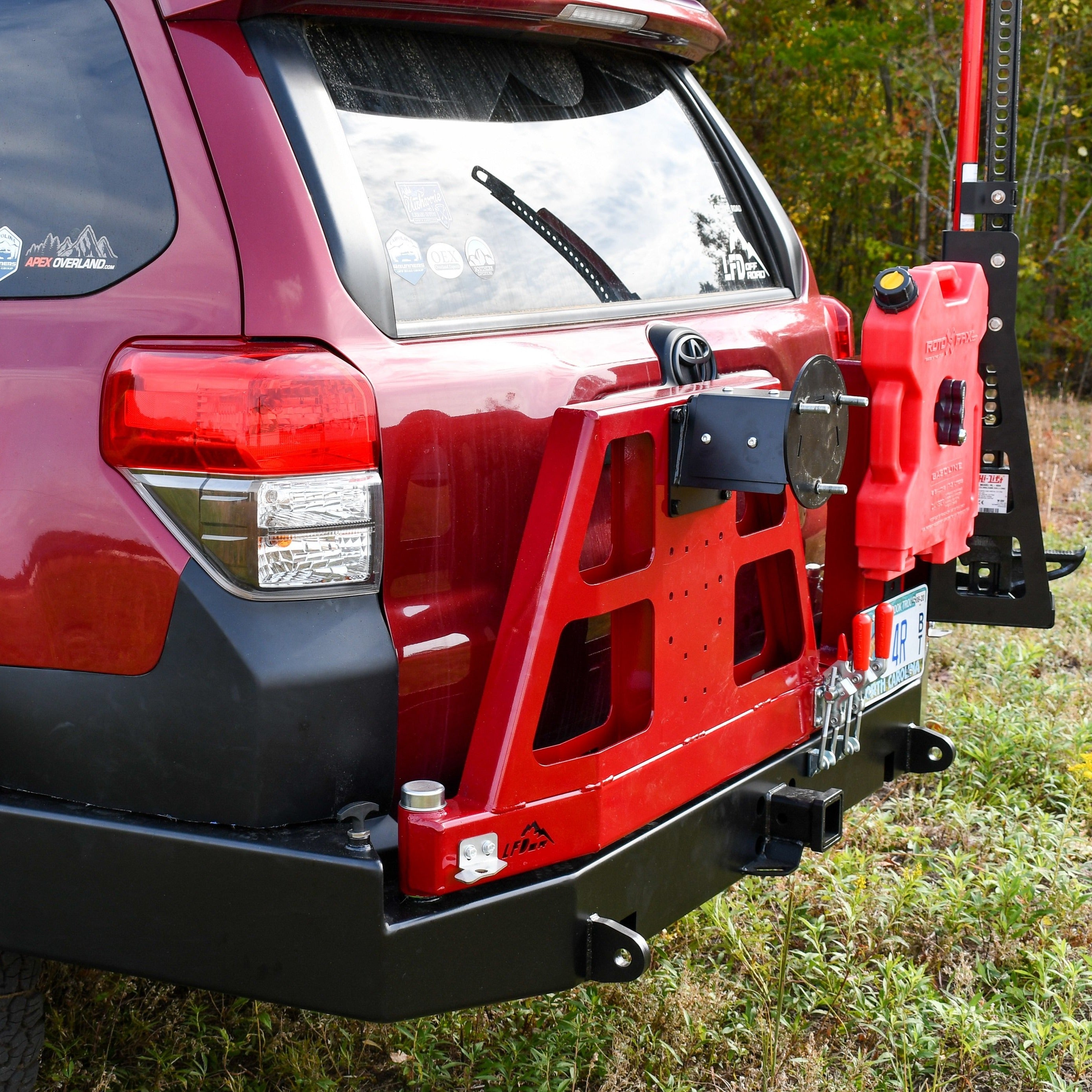 Swing arms are available with the tire on the Driver's Side or the Passenger side. The accessory arm comes standard with bolt patterns for RotoPax. We offer a Hi-Lift Mount, a combination Hi-Lift and Maxtrax mount, and single or dual Jerry Can mounts that bolt directly to the accessory swing arm as well.