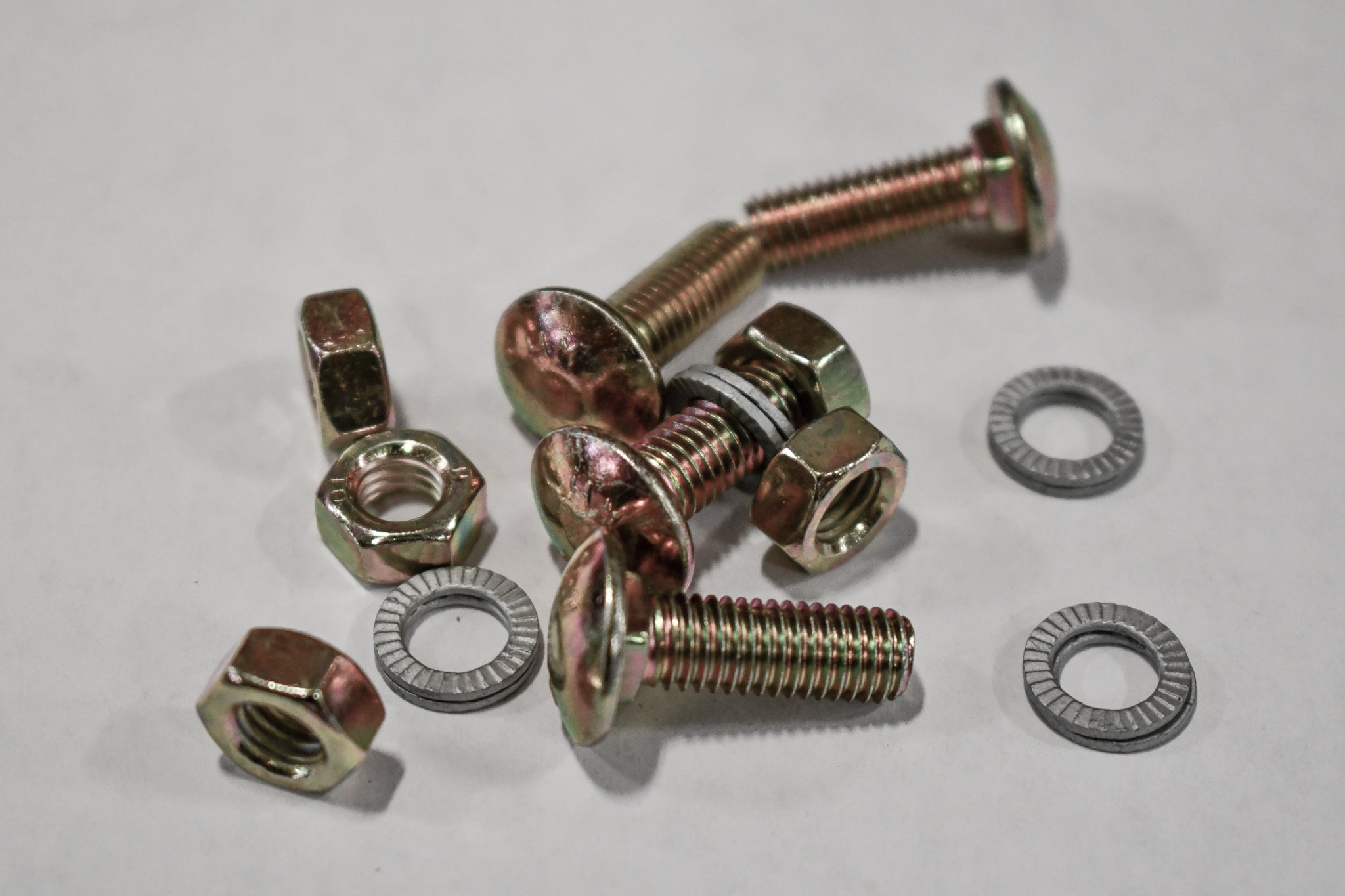 Our hardware is Grade 8.8 M8 bolts finished in a harsh environment coating with Nordlock washers and nuts. Nordlock washers are vibration resistant and take quite a bit of torque to loosen once tightened! These washers will not shake loose on the trail!