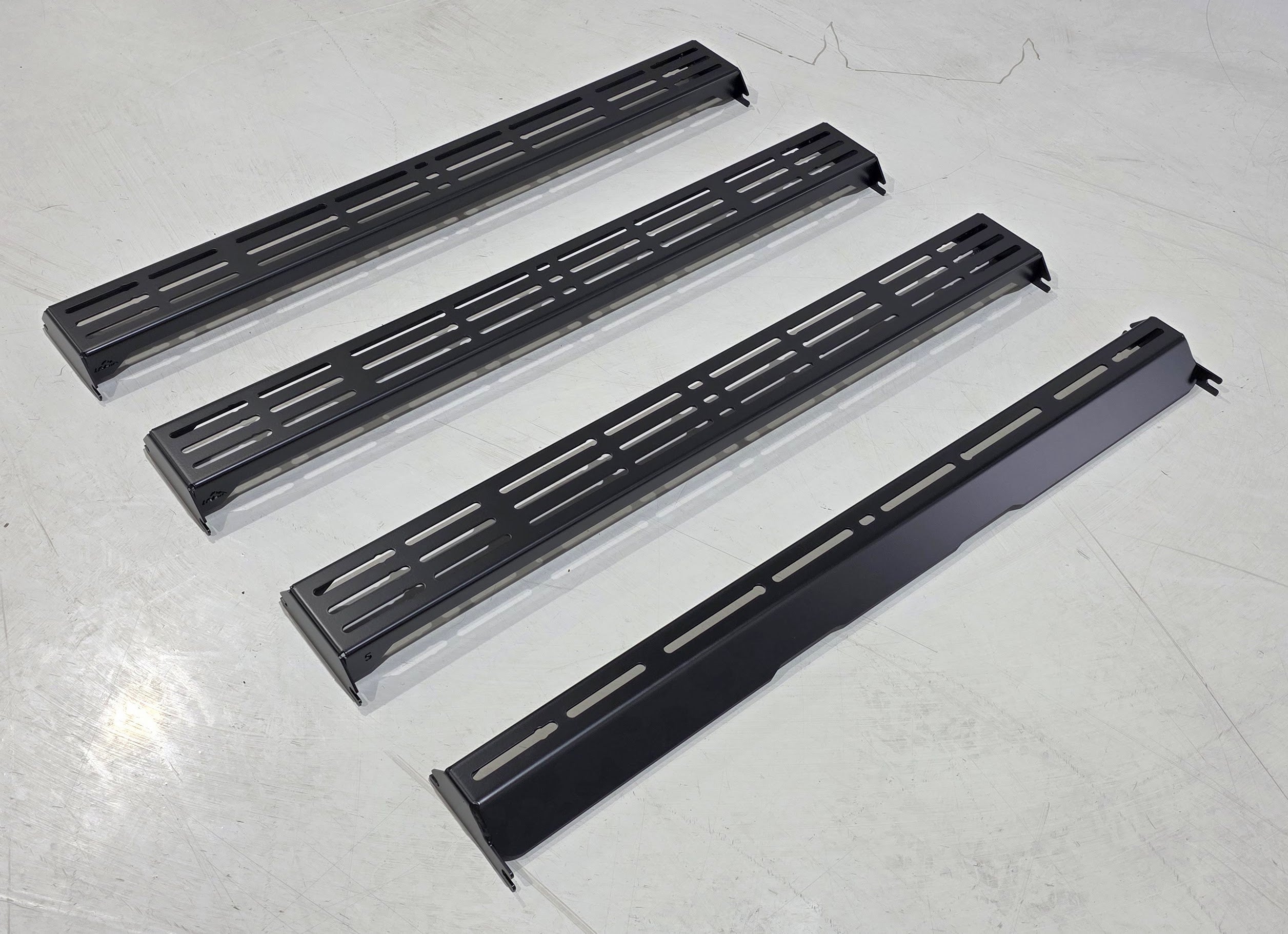 This listing is for a complete kit of Ruggedized Crossbars for 2010+ 4Runner Factory Roof Rails. This kit includes one of our Integrated Front Fairing Crossbars plus three WIDE 4" Ruggedized Crossbars.